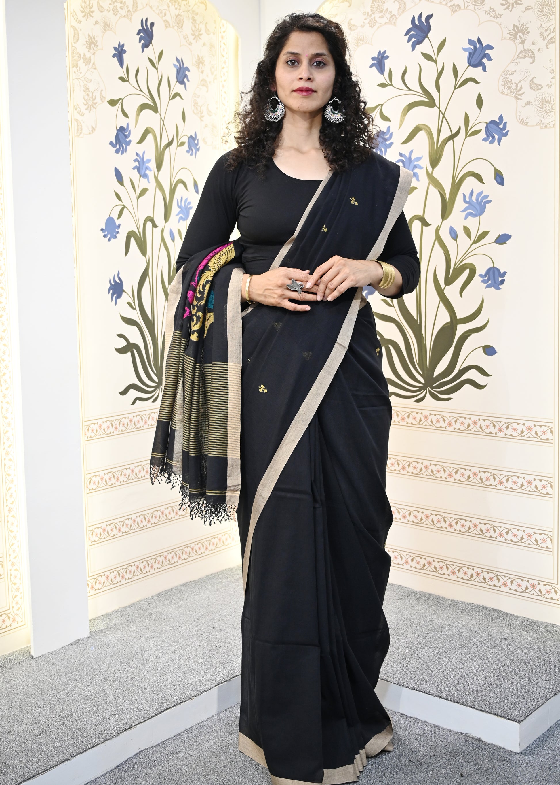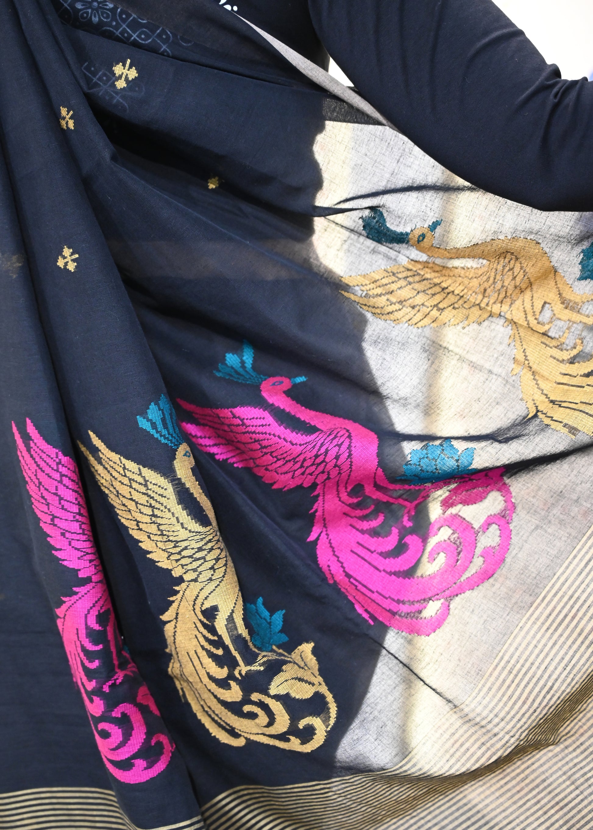 Discover the timeless elegance of our soft cotton Jamdani saree, meticulously handwoven with an exquisite grand pallu. Each piece showcases the intricate artistry of traditional weaving techniques, featuring delicate motifs that dance across the fabric. The breathable cotton construction ensures comfort throughout the day, while the generous pallu drapes beautifully for any occasion. Perfect for those who appreciate authentic craftsmanship and refined style, this saree combines heritage with wearability.