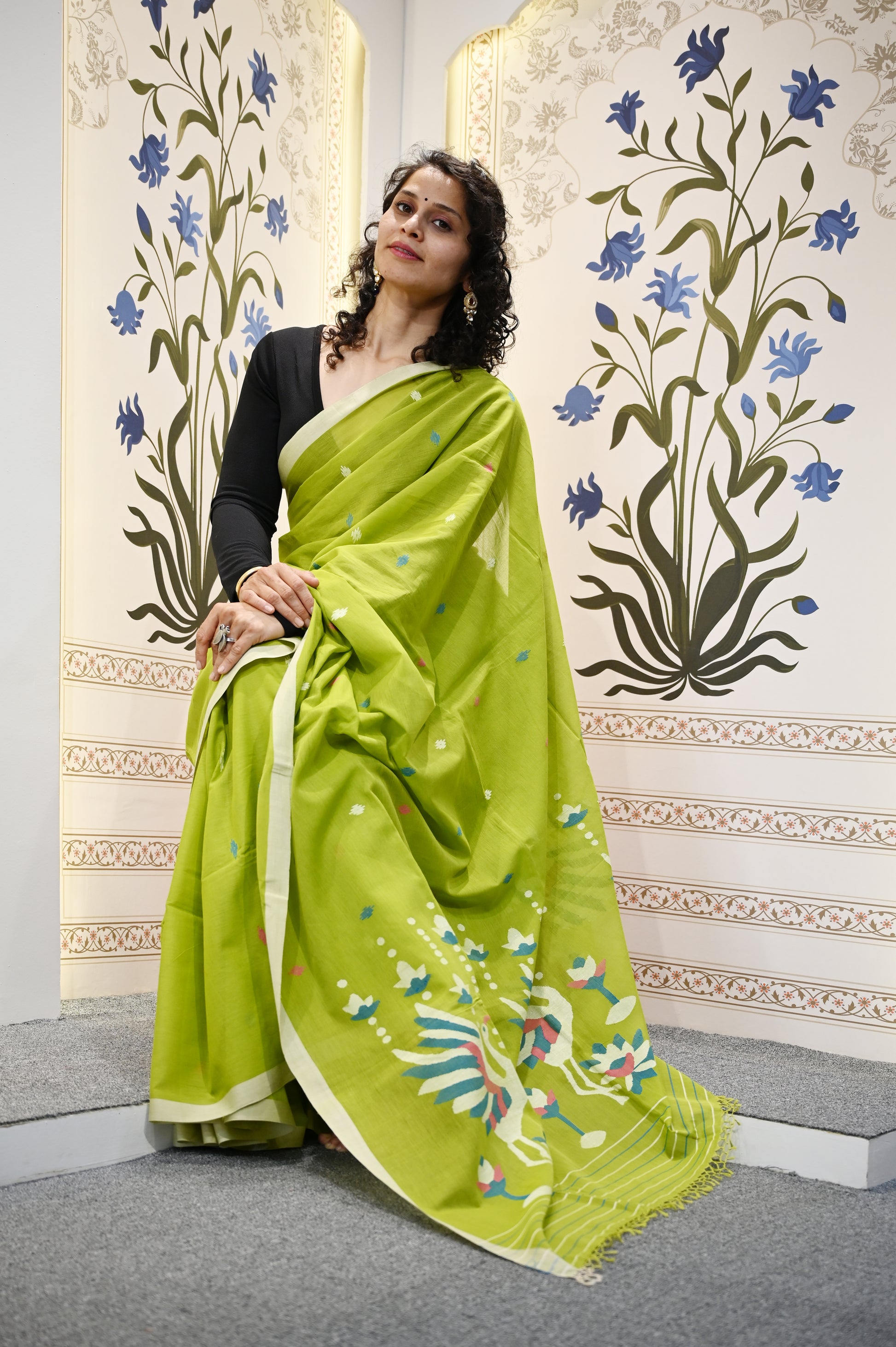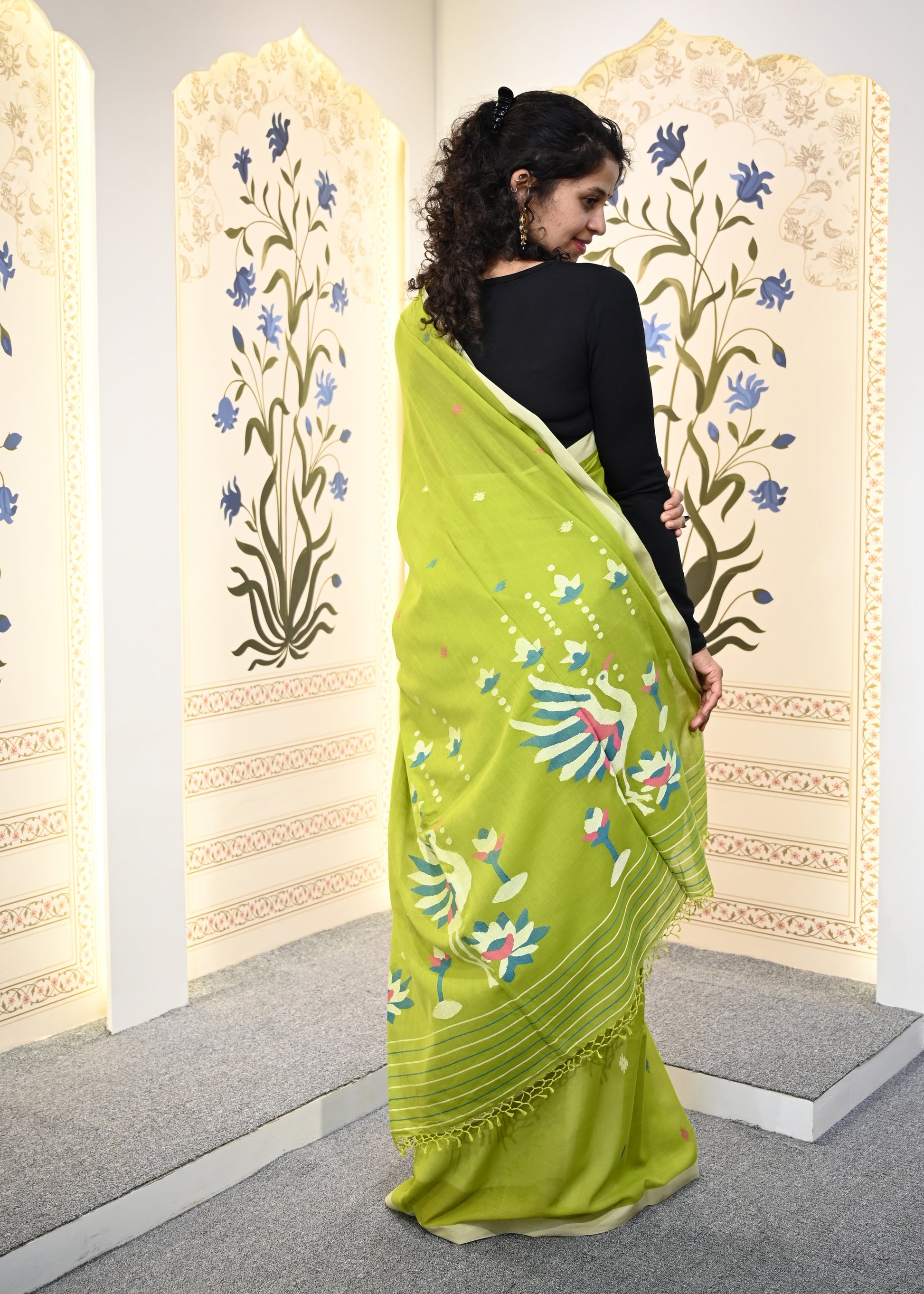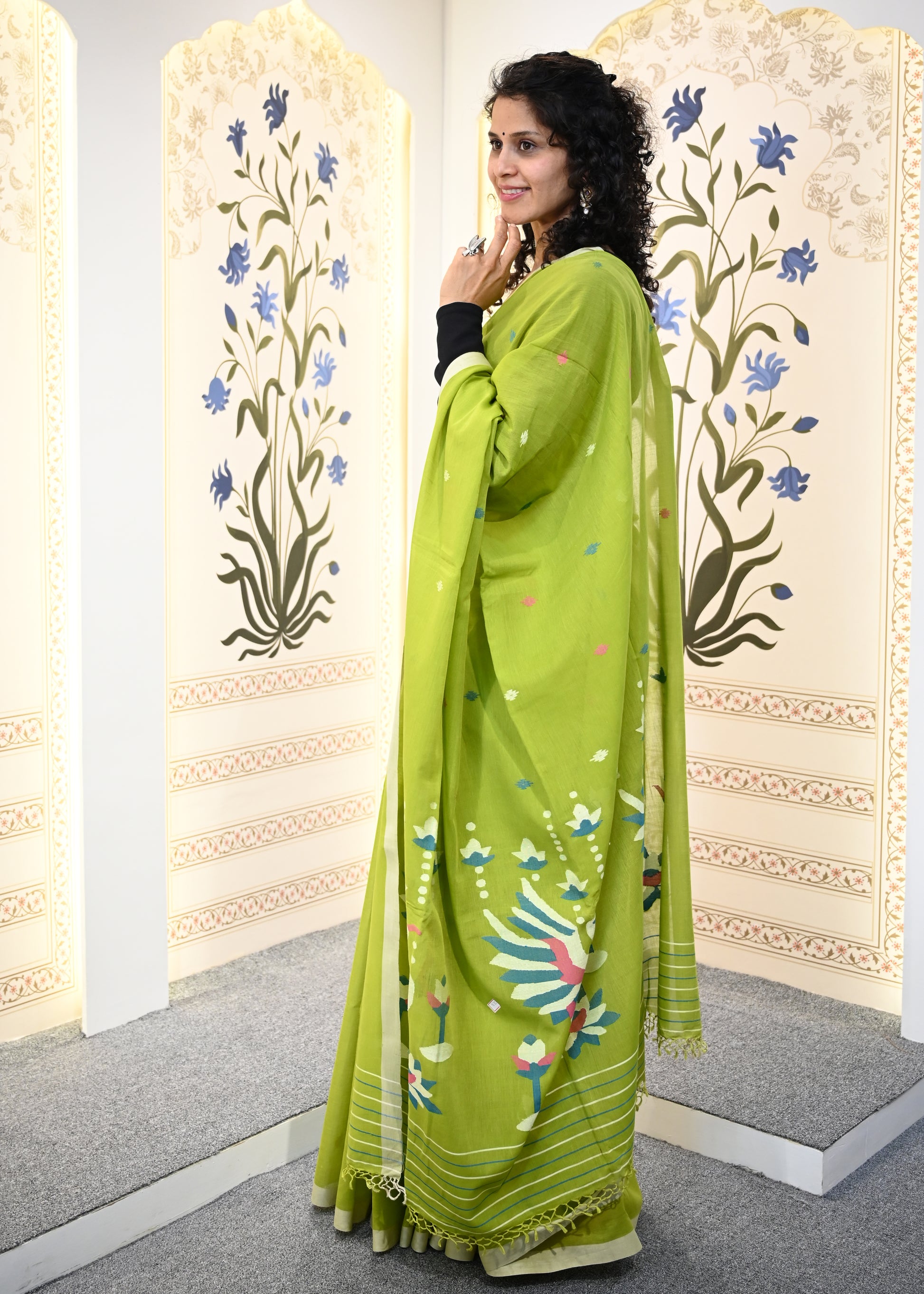 Mulcotton Jamdani Handwoven Pallu Experience the timeless elegance of traditional craftsmanship with this exquisite mulcotton jamdani pallu. Handwoven using time-honored techniques, this piece showcases intricate geometric and floral patterns characteristic of authentic jamdani weaving. The mulcotton blend offers a perfect balance of durability and comfort, ensuring the fabric drapes beautifully while maintaining its structural integrity. Ideal for sarees and traditional wear, this pallu elevates any ensemble with its sophisticated artisanal appeal. Each piece reflects the weaver's skill and dedication to preserving this centuries-old textile tradition.